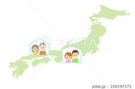 日本地図と高齢者夫婦と若い夫婦