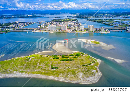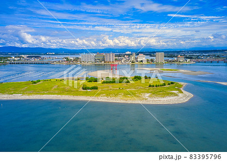 静岡県浜松市の浜名湖の有名な弁天島観光シンボルタワー、赤鳥居を含めてドローンでの空からの撮影