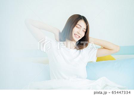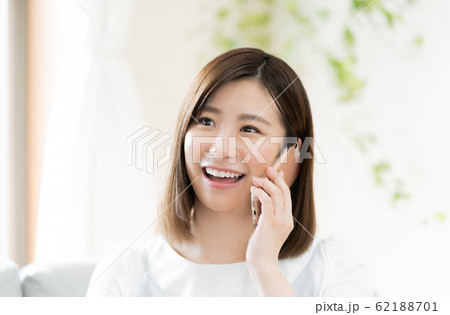 家で寝転がり笑顔でスマホを使って電話するアジア人女性