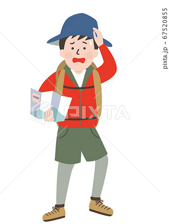 地図を持って困った様子のアウトドアスタイルの若い男性