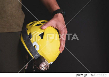 登山ヘルメットを持つ人 アウトドアイメージ素材