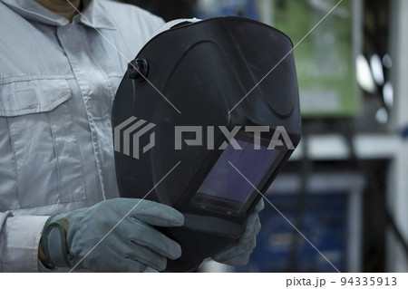 工場内で溶接マスクを持つ作業員男性手元
