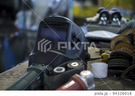 工場の作業台の上に置かれた溶接面