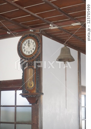 昔、小学校で使われていた昭和レトロな柱時計と鐘