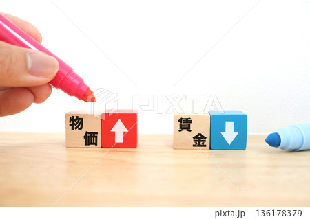 物価上昇と実質賃金低下を示す赤と青の対照構図。