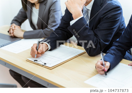 デスクに座り書類に記入しながら話を聞くスーツ姿のビジネスマンとビジネスウーマン