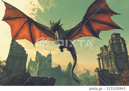 Majestic dragon soaring above ancient castle ruins under an overcast sky