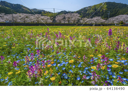 田んぼを使った花畑と那賀川の桜 静岡県賀茂郡松崎町