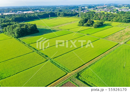 田園風景と那須塩原周辺、真夏の田園風景、8月の田園、早朝の田園風景、緑の綺麗な田んぼ、ドローン撮影、