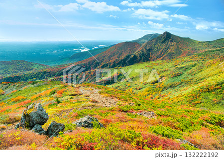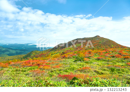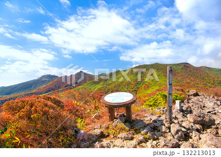 栃木県那須町 秋の紅葉に染まる山肌と朝日岳