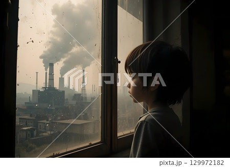 Environment impact and awareness, pollution concept, A boy holds a crystal-clear bubble in his hands, looking curious.