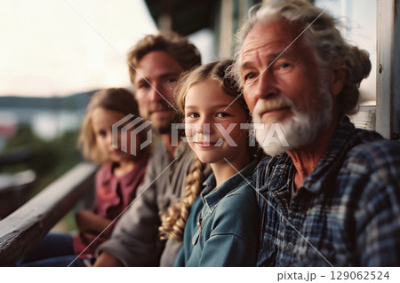 Family portrait featuring a smiling girl with braided hair, an elderly man with a beard, a young man, and a young girl, sitting together on a wooden porch during sunset, showcasing warmth and