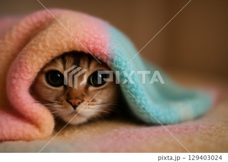 AI generated image of a cute Singapura cat peeking from a cozy pastel blanket with big eyes and a tiny nose. The soft colors, playful mood, and fuzzy texture evoke warmth and comfort.