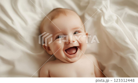 newborn baby lying on a clean white sheet, laughing with an open mouth, natural baby pose with soft diffused light, smooth skin tones, professional baby photoshoot, concept of childhood, maternity,