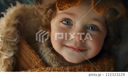 Close-Up of a Smiling Girl with Bright Blue Eyes in a Knitted Sweater