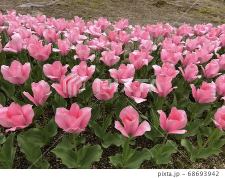 《ピンクに白の2色咲きチューリップ畑 メリーウィドー》