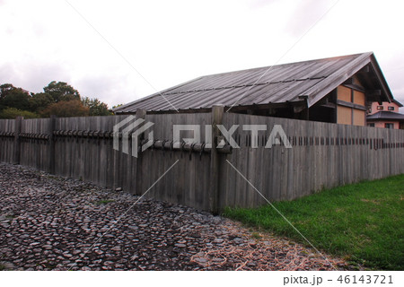 再建された志太郡衙の石敷道路と板塀及び掘立柱建物の板葺屋根(静岡県藤枝市)
