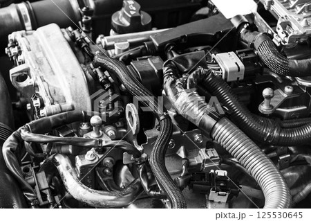 Car gasoline engine. Car engine part. Close-up image of an internal combustion engine. Engine detailing in a new car. Black and white