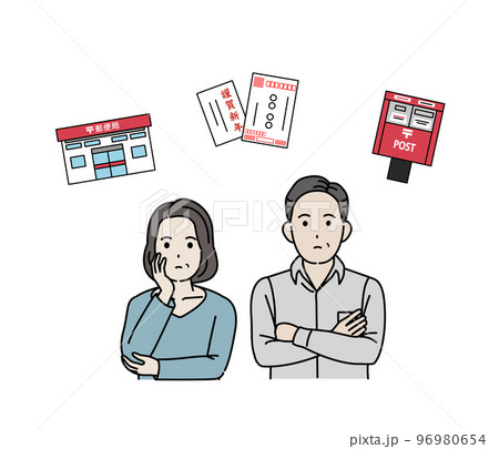 年賀状や葉書を出すのを考える中年の夫婦のイラスト