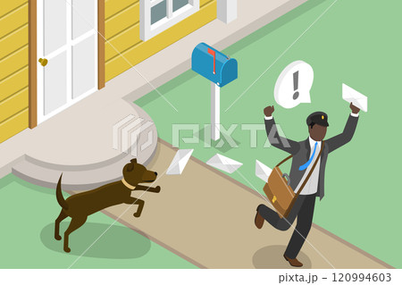 3D Isometric Flat Vector Illustration of Frightened Postal Worker , Mailman Fleeing Furious Security Dog