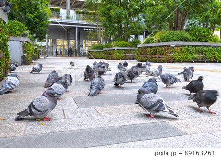 日本の横浜都市景観 地下鉄 センター南駅前のハト。突然、群れが飛来…