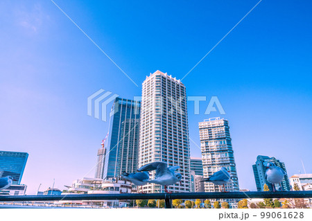日本の横浜都市景観 JR横浜タワーや横浜駅、横浜ベイクォーターなどを望む。かわいいユリカモメも鎮座