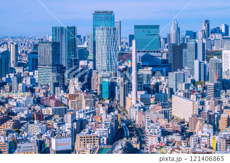 日本の東京都市景観 恵比寿ガーデンプレイスタワーや恵比寿駅、電車などを望む