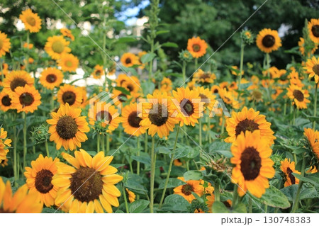 ジュネーブの花壇に咲くヒマワリと都市の緑の調和