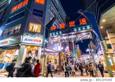 日本の川崎都市景観 川崎駅前の人気商店街「銀柳街」やドン.キホーテなどを望む