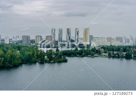 Panoramic view of modern high-rise residential buildings in Moscow with river and park