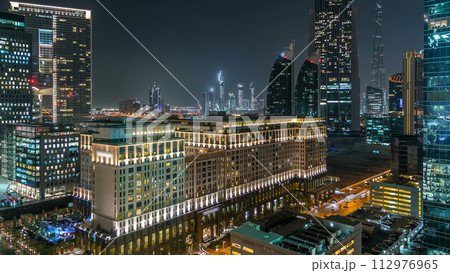 Dubai downtown architecture at night timelapse. Aerial view of numerous skyscrapers near Sheikh Zayed road.