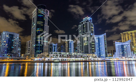 Dubai Marina towers and canal in Dubai night timelapse hyperlapse