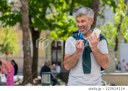 Happy mature man use credit bank card smartphone while transferring money purchases online shopping