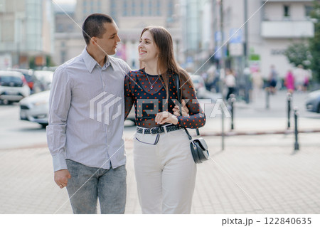 Two tourists having fun on romantic summer vacation in Poland - Holidays and traveling lifestyle concept. Young couple walking street on vacation. Happy couple of travelers enjoying.