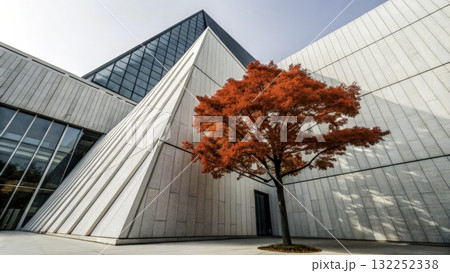 Striking red tree contrasts with modern architecture in urban setting during clear blue sky