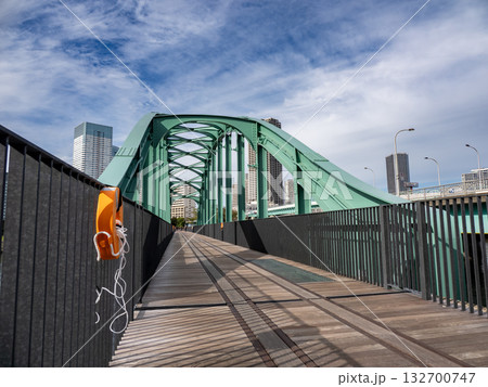 遊歩道化された旧晴海鉄道橋の廃線跡から望む 春海橋と高層マンション群