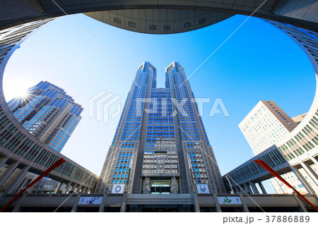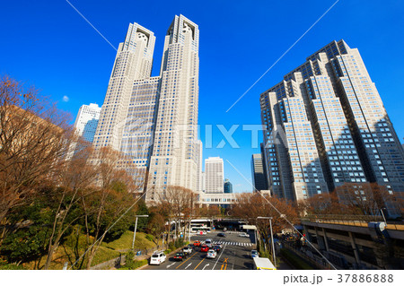 秋晴れの青空にそびえる東京都庁舎(東京都新宿区)