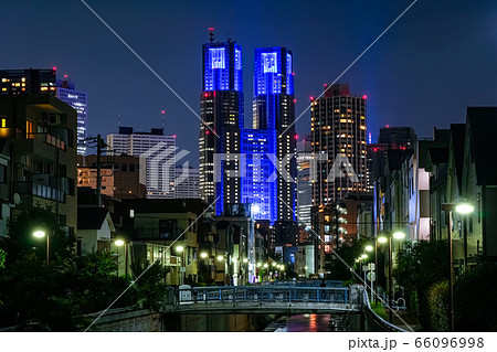 東京都庁 夜景 ブルーライトアップ 神田川、花見橋から(中野区)