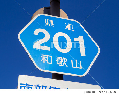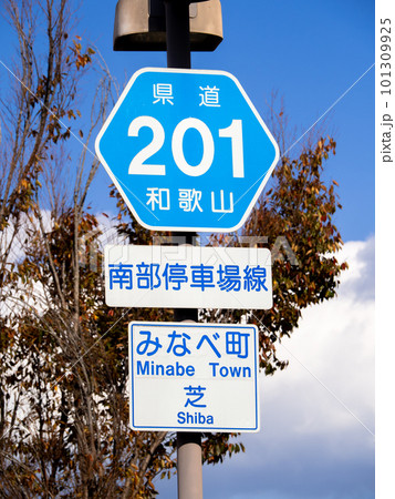道路標識(案内標識)「都道府県道番号」。和歌山県道201号南部停車場線。和歌山県日高郡みなべ町内。