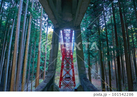 東京都青梅市 御岳山参道の杉並木と交わる御岳登山ケーブルカーの架線を見上げるポイント