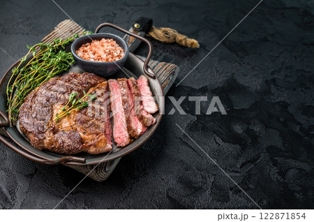 Grilled Rib eye prime steak, roasterd dry aged beef meat. black background. top view