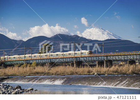 富士山と酒匂川の鉄橋をを渡る小田急電車