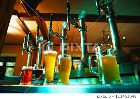 Several glasses of divergent beer standing on bar counter. Enjoying good taste, well-crafted brew