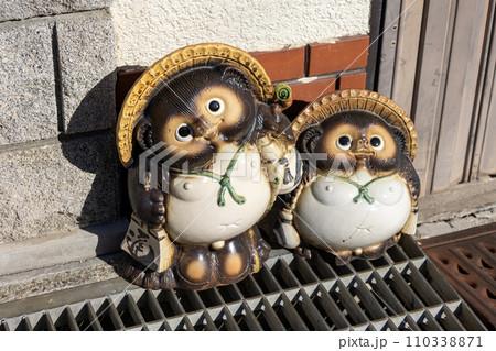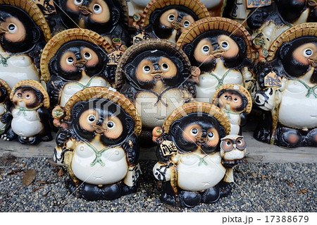 商売の縁起物、信楽焼で有名な狸の置物の写真