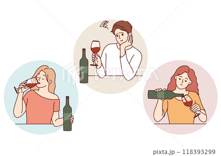 Female alcoholism set. Woman suffering from hard drinking, alcohol addiction. Drunk woman with a bottle of booze. Dangerous habit, unhealthy lifestyle awareness. Flat vector illustration