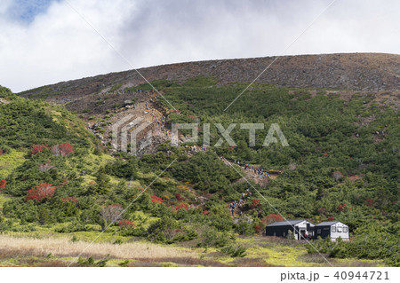 福島県福島市または猪苗代町の境にある秋季一切経山の登山道にある酸ヶ平避難小屋を臨む景色