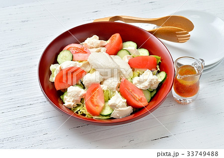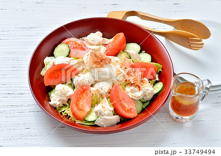 豆腐サラダ、とうふサラダ、和風サラダ、(絹ごしお豆腐、レタス、キュウリ、トマト)醤油ドレッシング。