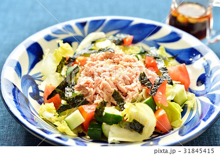 和風ツナサラダ。レタス、キュウリ、トマト、ツナ(ツナフレーク)、海苔、ゴマ。ドレッシング添え。
