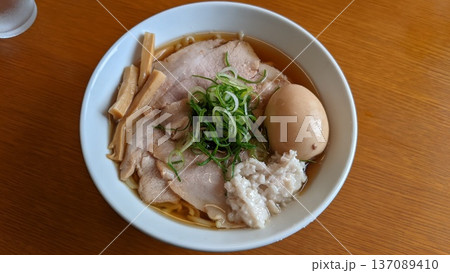 ワンタンとチャーシューをトッピングした醬油ラーメン