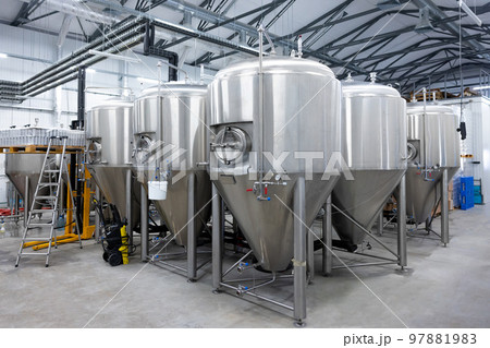 Modern Beer Factory. Steel tanks for beer fermentation and storage. Brewery. Modern beer plant with brewering kettles
